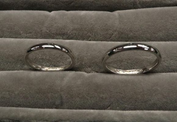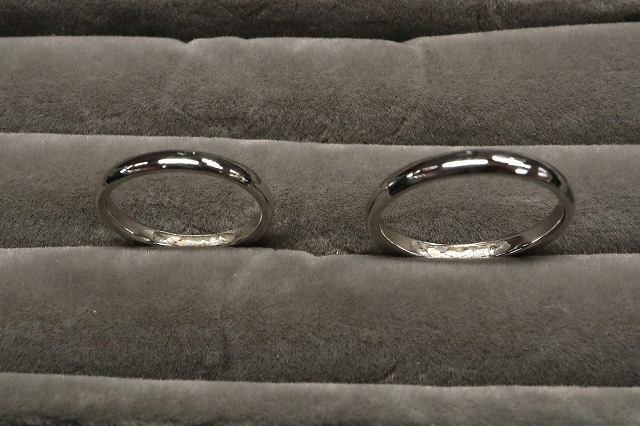 甲丸のシンプルなペアの遺骨リングで斜めラインにつや消し加工を入れられスタイリッシュなリングをお作りされました