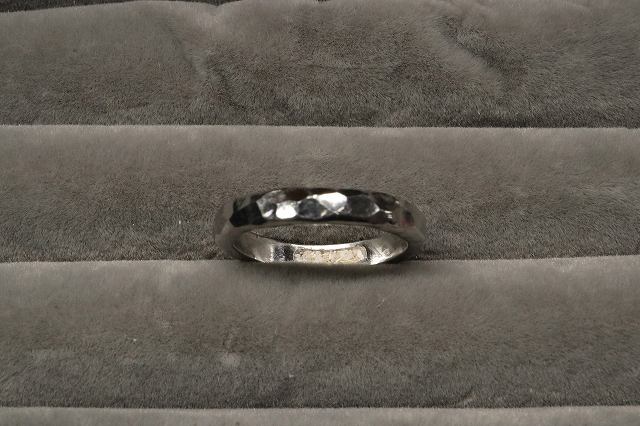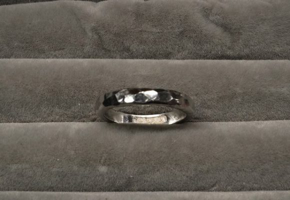 指輪は不規則に鎚目をつけられスタイリッシュ