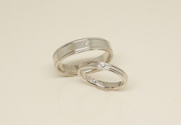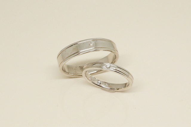 トップ>お客様の声一覧>オリジナルジュエリー>手作りペアリング 手作りペアリング とても楽しく作ることが出来て良かったです。しんみになって作るのを手伝ってくださりありがとうございました。最高の思い出ができました。デザインから、最後リングが出来上がるまで丁寧に相談井乗ってくださりとても素敵なペアリングが出来あがりました。ありがとうございました。(今回のお客様はシンプルながらにも溝を作ってスタイリッシュで使いやすいデザインに。お二人とも1粒ダイアモンドをおいれし華やかな素敵なデザインに仕上がりました。) 一覧へもどる